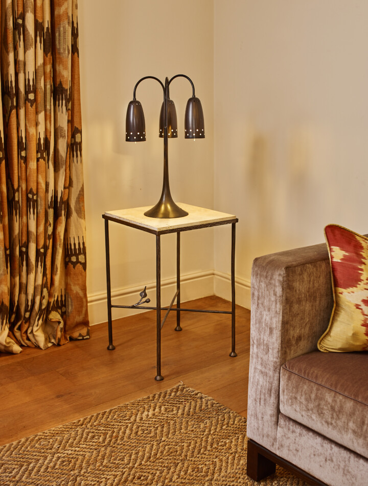 Brussels Table Lamp in Bronze Brass. Shown with Leaf Side Table.