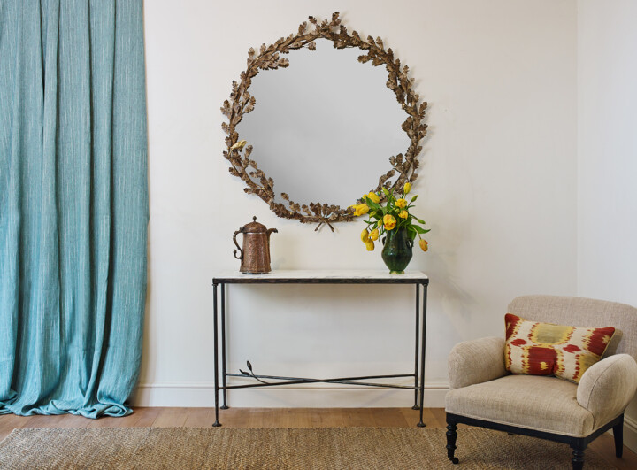 Leaf Console Table in Antique Iron in smaller size. Shown with Oak Branch Circular Mirror.