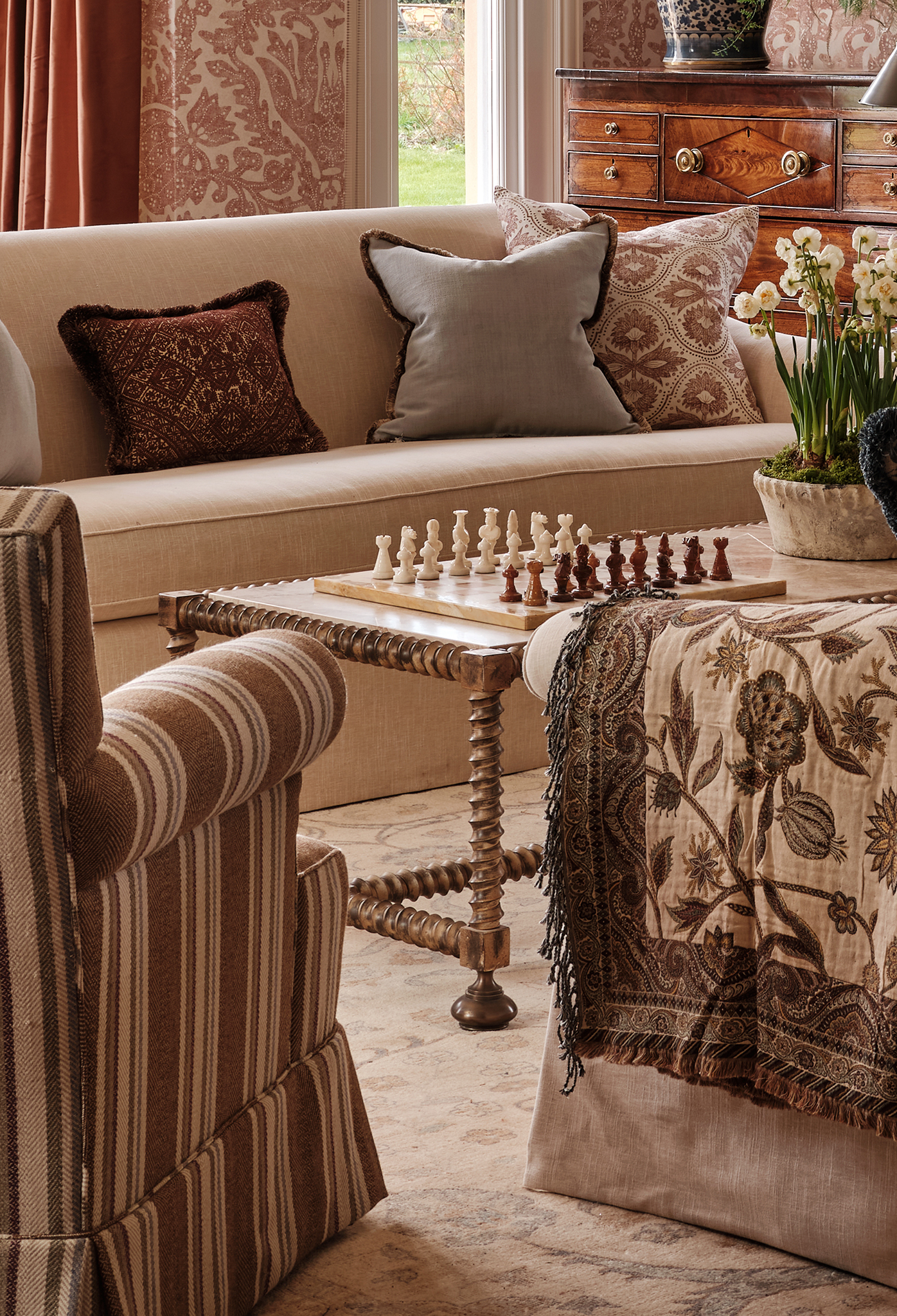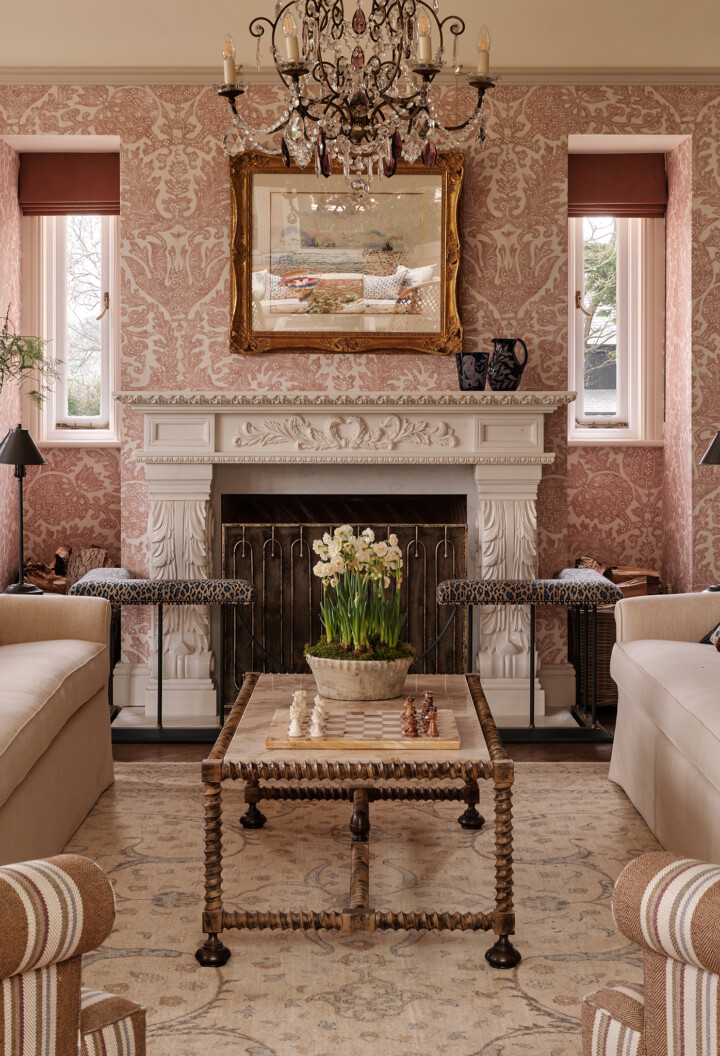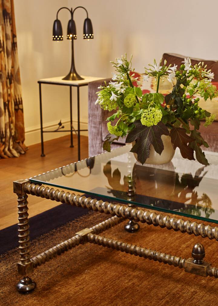 Twisted Leg Coffee Table in Antique & Antique Brass finish with marble top. Interior designed by Rebecca Hughes Interiors. Photography: Astrid Templier Photography.